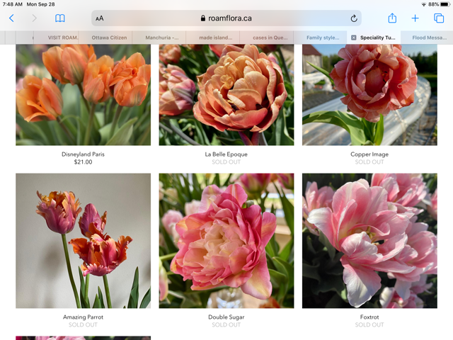 Look at their website.. they have some amazing tulip bulbs only available another couple of weeks, and so far, I have found nothing decent in the way of bulbs here in Ottawa. I ordered some in April as I was afraid there would be none left come fall, and that is what happened – some shipments were held up in a strike on the docks in Montréal, and others were never ordered or even grown as we remember from the destruction of millions of bulbs in the Netherlands. There will be fewer bulbs in the gardens come spring, but let it act as a reminder to order bulbs and all other things – peonies, iris – very early next year. Write to the growers and get on their mailing lists now so you don’t miss out. They will send a reminder when their catalogues are in.